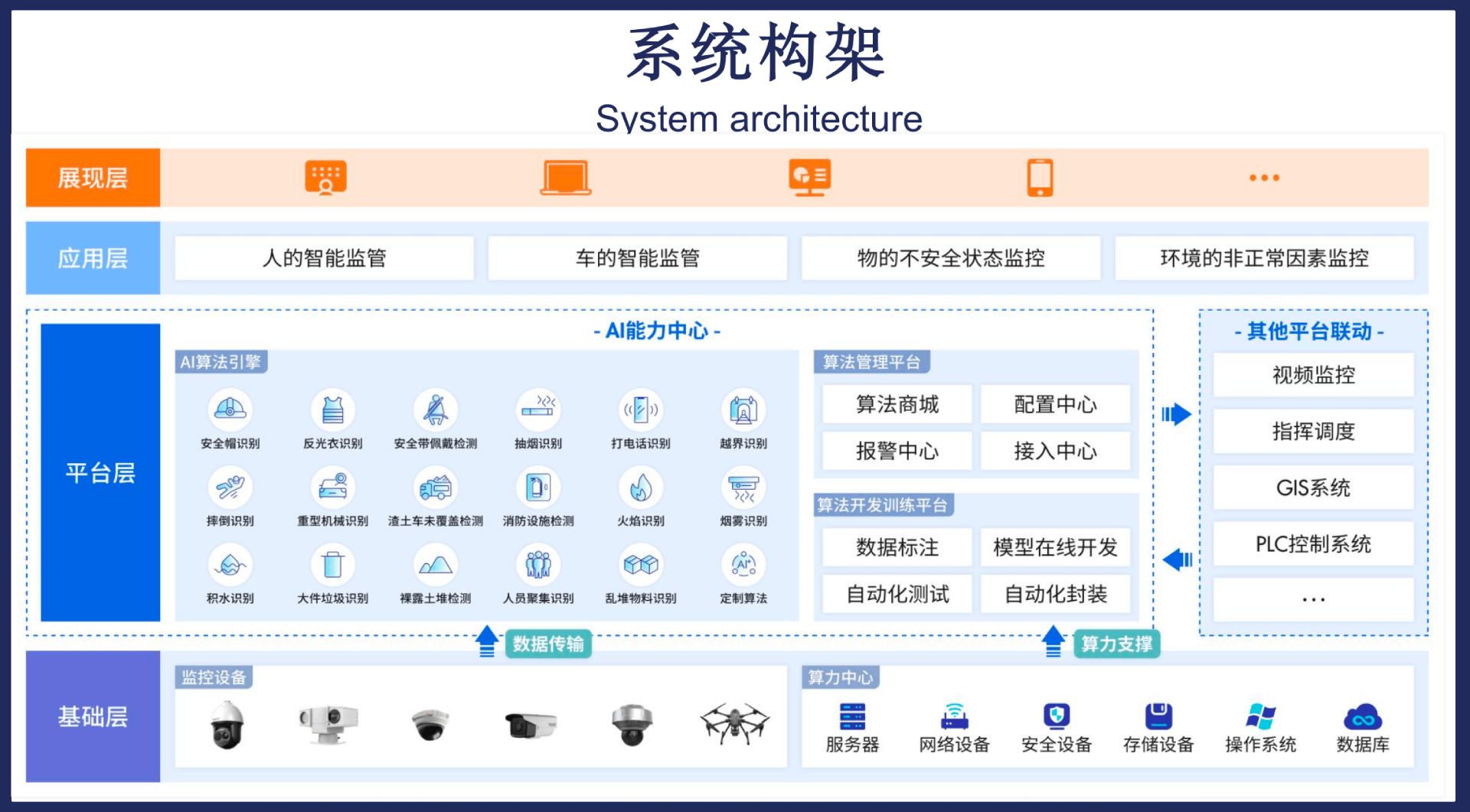 AI视觉算法是基于大规模数据训练出来的CV模型,通过SDK或服务器调用的方式本地化部署,可以兼容市面上大部分摄像头,通过多种算法多种组合的方式,对视频流、图片进行分析,智能识别和分析人的不安全行为、物的不安全状态以及环境的不安全因素,安全事故率降低65%以上,大幅提升安全监管效率和质量。